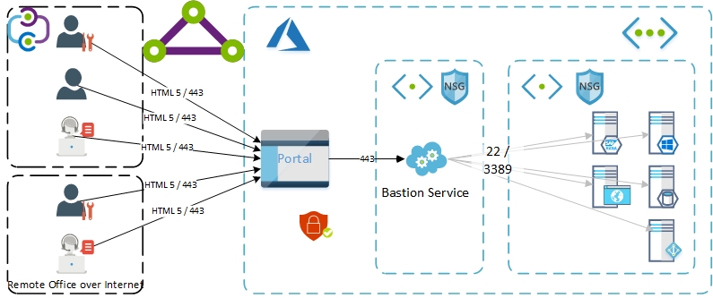 So, instead of launching your remote client and making a connection, you log into the Azure portal (which allows MFA and has granular built-in RBAC), and use the Bastion connection function. Your remote session is then launched using HTML 5 over port 443 in a browser window.