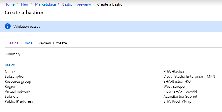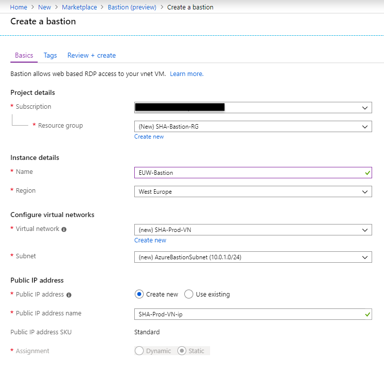 As it is a preview service you’ll need to use the preview URL. Bastion Preview. Then click “Create”. Fill out the requisite parts of the form. It is key that you create a new subnet called AzureBastionSubnet. Bear in mind that this subnet will need to be able to route to the servers you want to connect to.