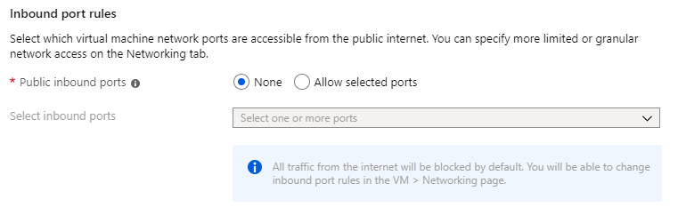 I’ve created my bastion host service. Now I need some VMs to test with. Crucially I didn’t need to set any inbound port rules as part of VM creation.